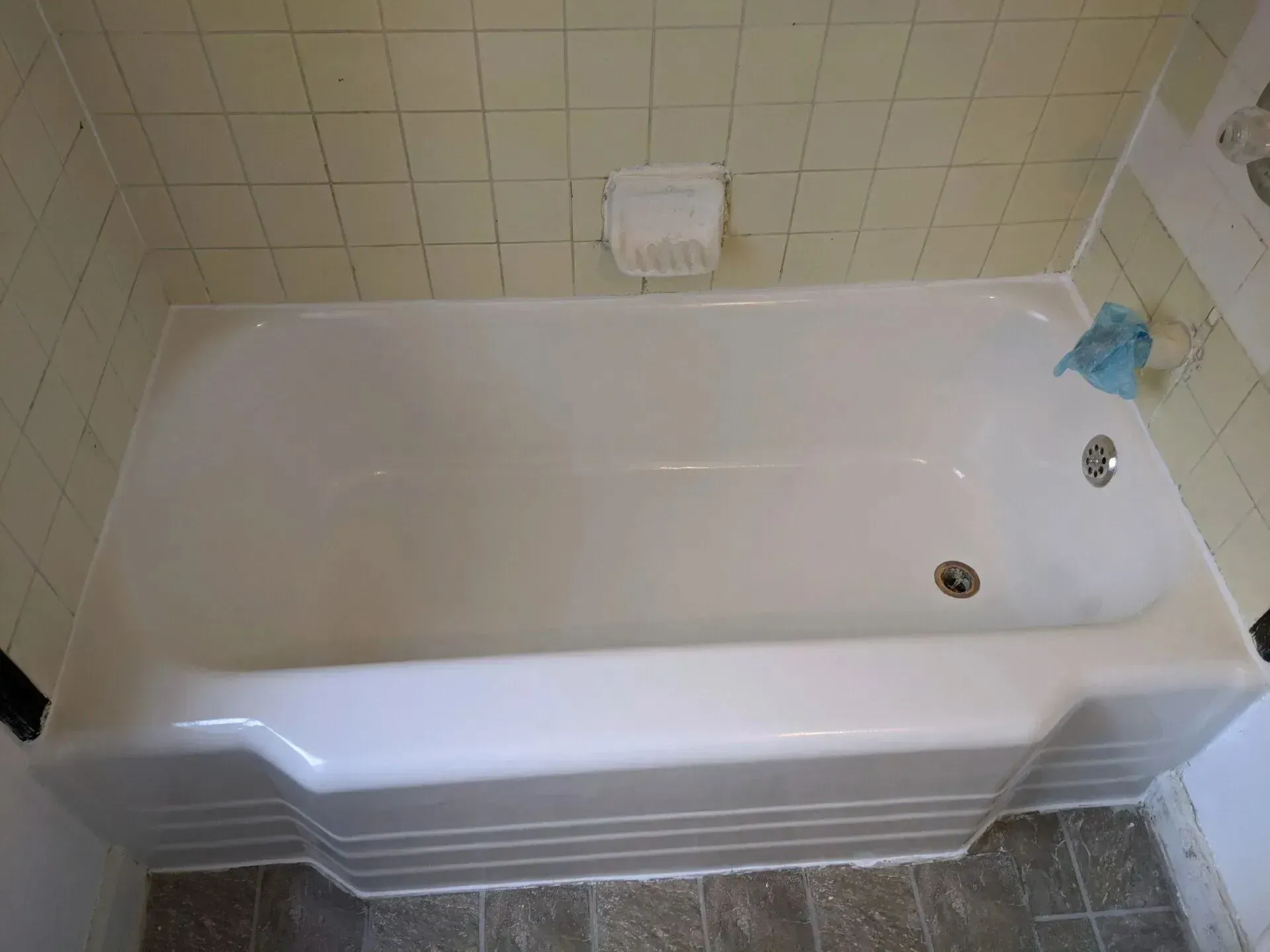 Once the finish coat is set, we carefully remove all masking tape, paper, and protective sheeting. We reinstall drain covers, overflow plates, and any hardware or trim removed earlier. We also reapply caulk around the bathtub edges, drain, and overflow plate using a recommended quality caulk (not self-adhesive strips) to secure a watertight seal without damaging the new finish.